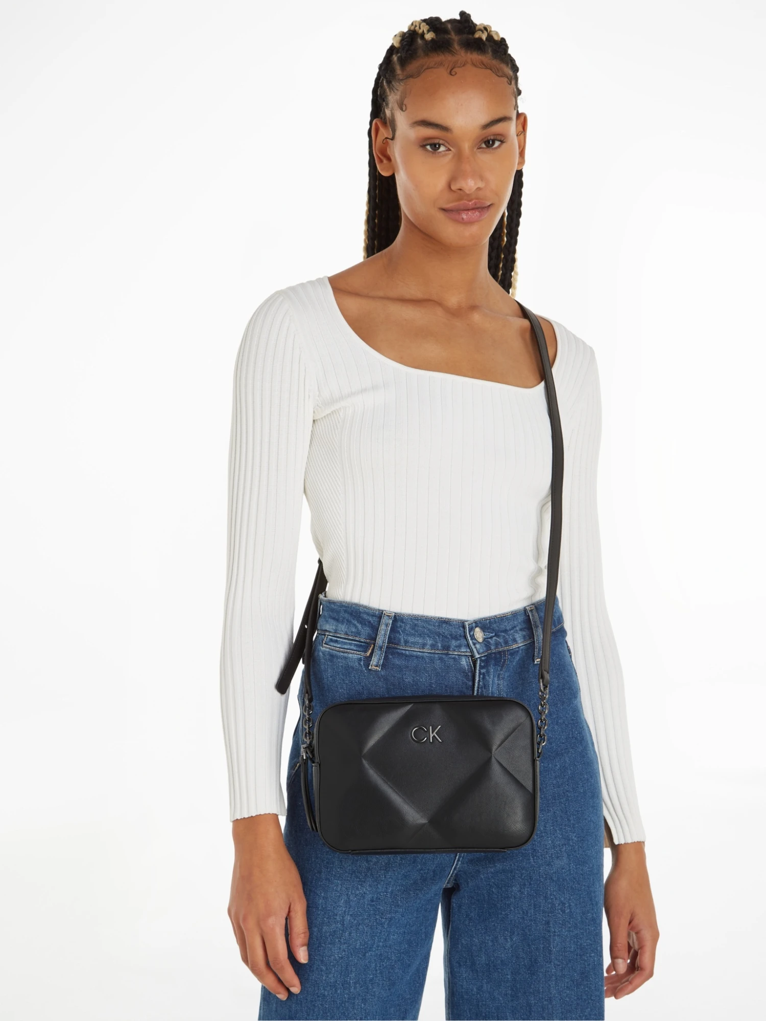 Das Außenmaterial der Crossbody Bag besteht zu 51 % aus recyceltem Polyester und zu 49 % aus wasserbasiertem Polyurethan, mit Ausnahme des Besatzes.