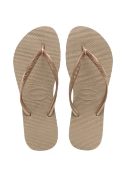 Der Havaianas Slim ist die feminine Version der Kult Flip Flops aus Brasilien. Die Riemen und die Sohle sind dünner als bei den Unisex Modellen und lassen die Füße zierlicher wirken. Die Flip Flops sind aus Kautschuk, daher sind sie super bequem, rutschfest, formstabil und perfekt geeignet für einen ausgelassenen Sommer. Das legendäre Reiskornmuster auf der Sohle macht sie unverwechselbar. Die Farbpalette ist riesig und wird jedes Jahr um Trendfarben erweitert.