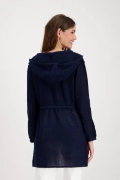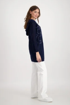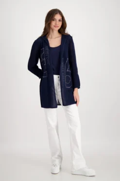 Mit dieser offenen Strickjacke von monari ergänzen Sie gekonnt Ihre Outfits. Die Kapuzenjacke mit Regular Fit Form überzeugt mit einem Ajourmuster mit glitzerndem Lurex und einem Strickmuster glatt rechts mit Strass und 3D Buchstaben auf der Vorderseite. Ein weiteres Highlight dieser Ajour Strickjacke ist die Taille mit Tunnelzug und einem Band mit Kordelstopper zum regulieren der Form.